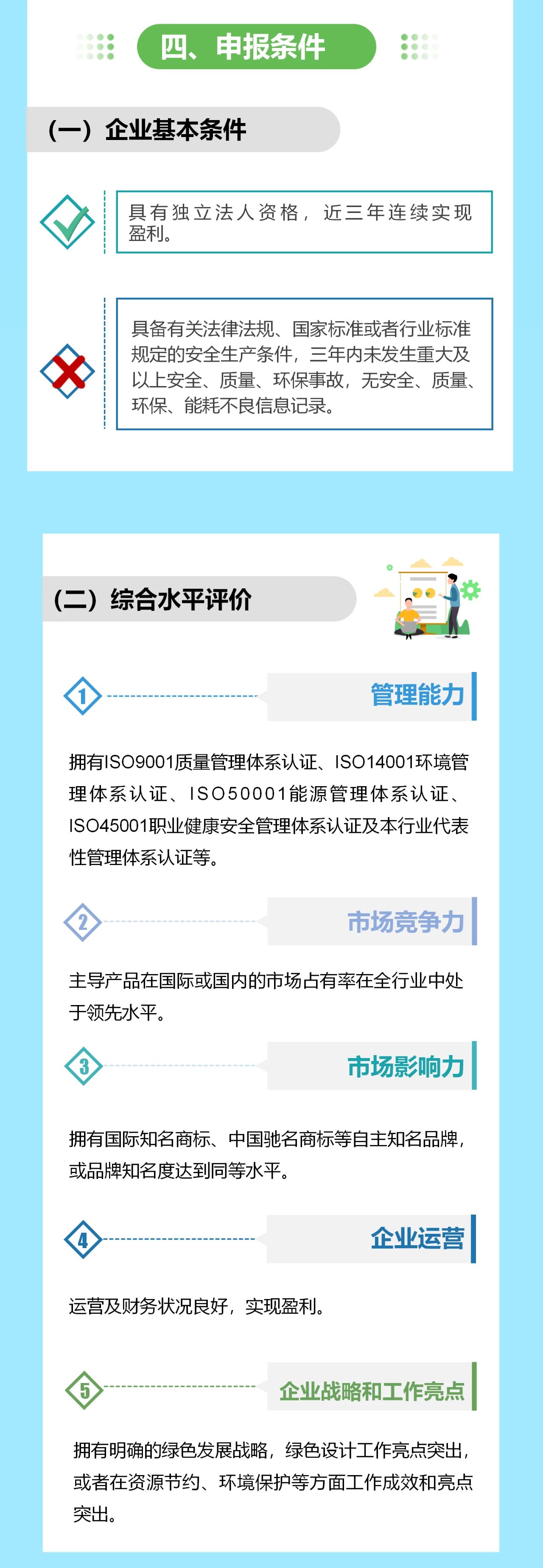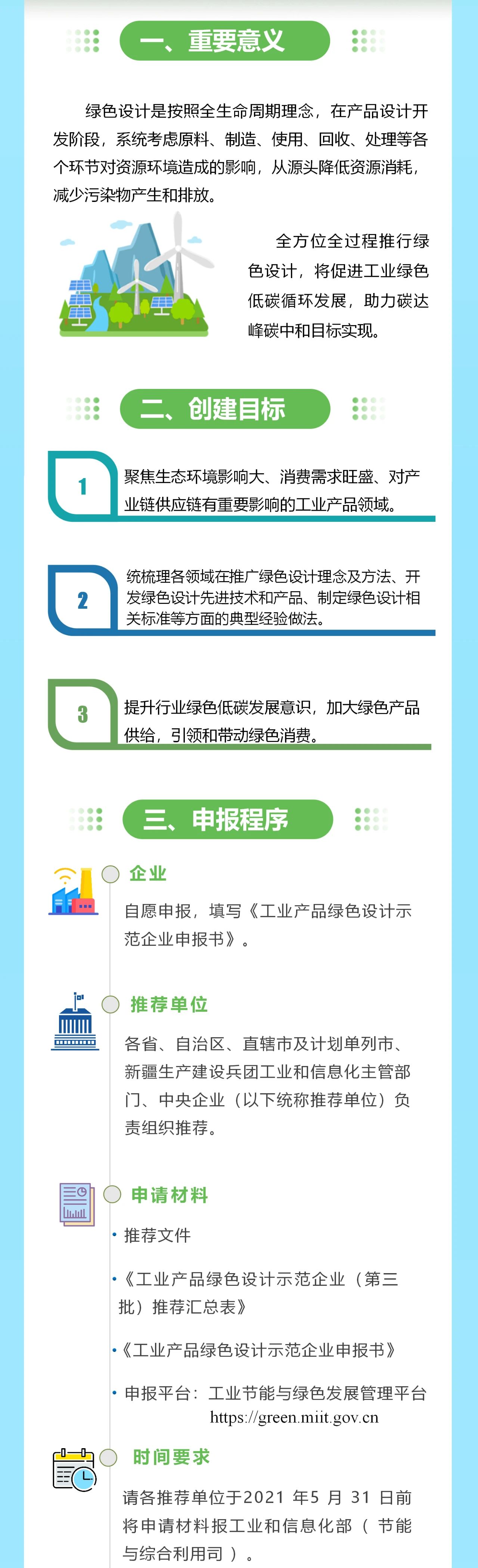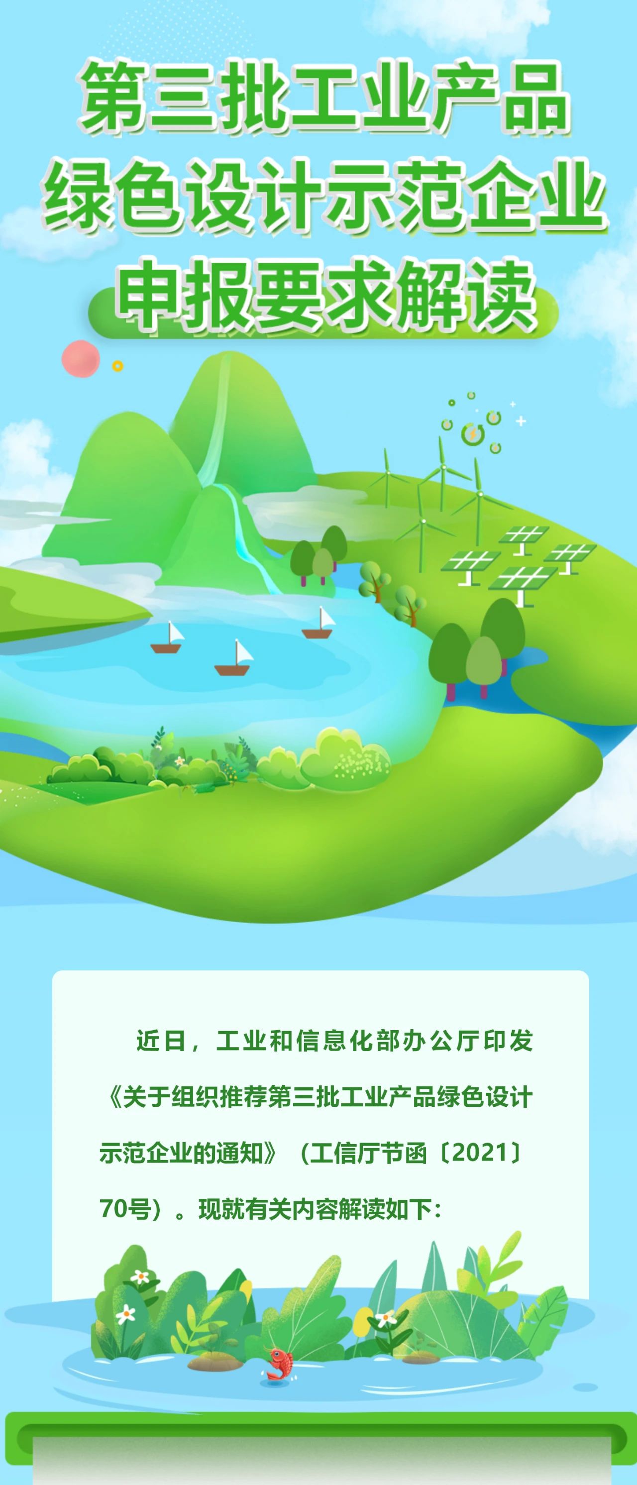 為貫徹落實《國務(wù)院關(guān)于加快建立健全綠色低碳循環(huán)發(fā)展經(jīng)濟體系的指導(dǎo)意見》(國發(fā)〔2021〕4號),全方位全過程推行綠色設(shè)計,促進工業(yè)綠色低碳循環(huán)發(fā)展,助力碳達峰碳中和目標(biāo)實現(xiàn),現(xiàn)組織開展第三批工業(yè)產(chǎn)品綠色設(shè)計示范企業(yè)推薦工作。有關(guān)事項通知如下: