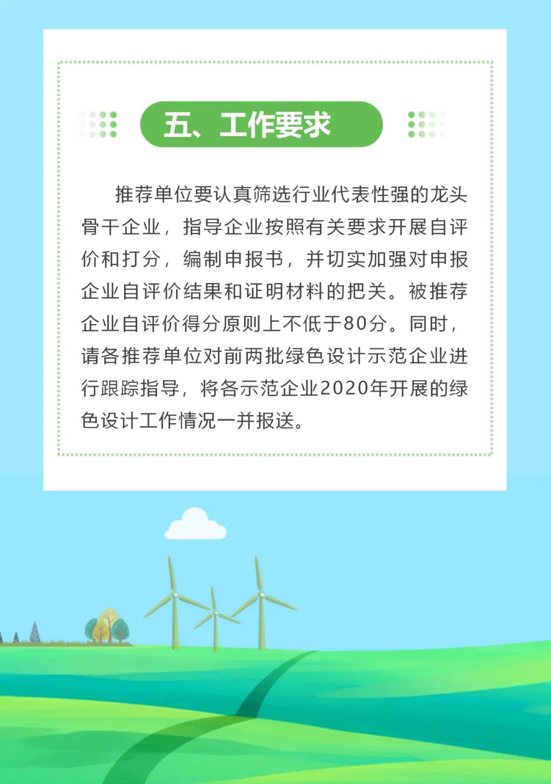請各推薦單位于2021年5月31日前將推薦文件、《工業(yè)產(chǎn)品綠色設(shè)計示范企業(yè)(第三批)推薦匯總表》(附件2)及企業(yè)申報書等電子版材料通過工業(yè)節(jié)能與綠色發(fā)展管理平臺(https://green.miit.gov.cn)報送工業(yè)和信息化部(節(jié)能與綜合利用司)。同時,請各推薦單位對前兩批綠色設(shè)計示范企業(yè)進行跟蹤指導(dǎo),將各示范企業(yè)2020年開展的綠色設(shè)計工作情況(可參考附件1自評價表有關(guān)要點)一并報送。