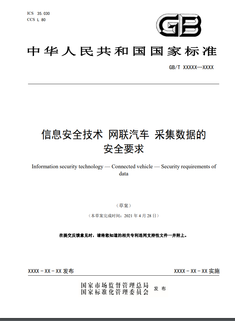 2021年4月29日,全國信息安全標(biāo)準(zhǔn)化技術(shù)委員會發(fā)布了關(guān)于征求《信息安全技術(shù)網(wǎng)聯(lián)汽車采集數(shù)據(jù)的安全要求》標(biāo)準(zhǔn)草案意見的通知,面向社會公開征求意見。