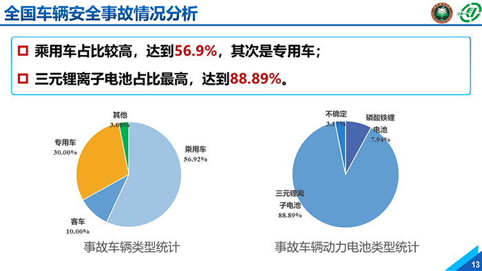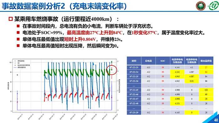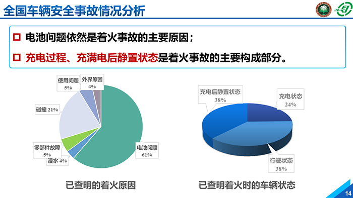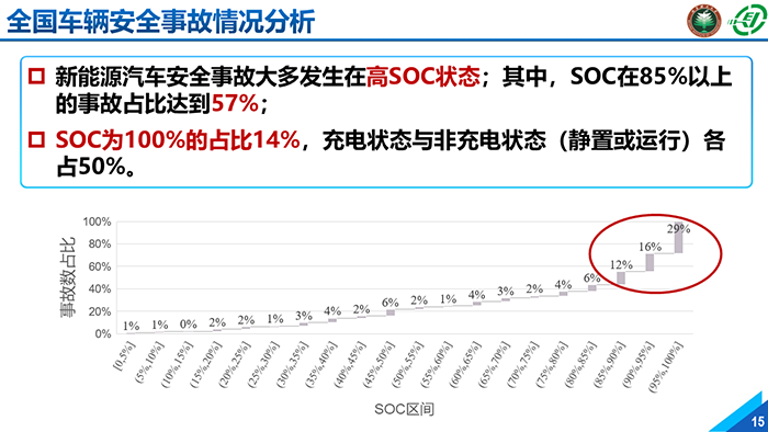 車輛應(yīng)用特征與安全性方面,統(tǒng)計(jì)發(fā)現(xiàn),電池問題依然是著火事故的主要原因。已查明著火時(shí)的車輛狀態(tài),充電過程、充滿電后靜置狀態(tài)是著火事故的主要構(gòu)成部分。新能源汽車安全事故大多發(fā)生在高SOC狀態(tài),其中SOC在85%以上的事故占比達(dá)到57%,SOC為100%的占比為14%。充電狀態(tài)與非充電狀態(tài)(靜置或運(yùn)行)各占50%。電池隨著長(zhǎng)時(shí)間以及高里程的使用有一個(gè)退化的過程,退化的過程中是否適合把電池充滿都是值得關(guān)注的。