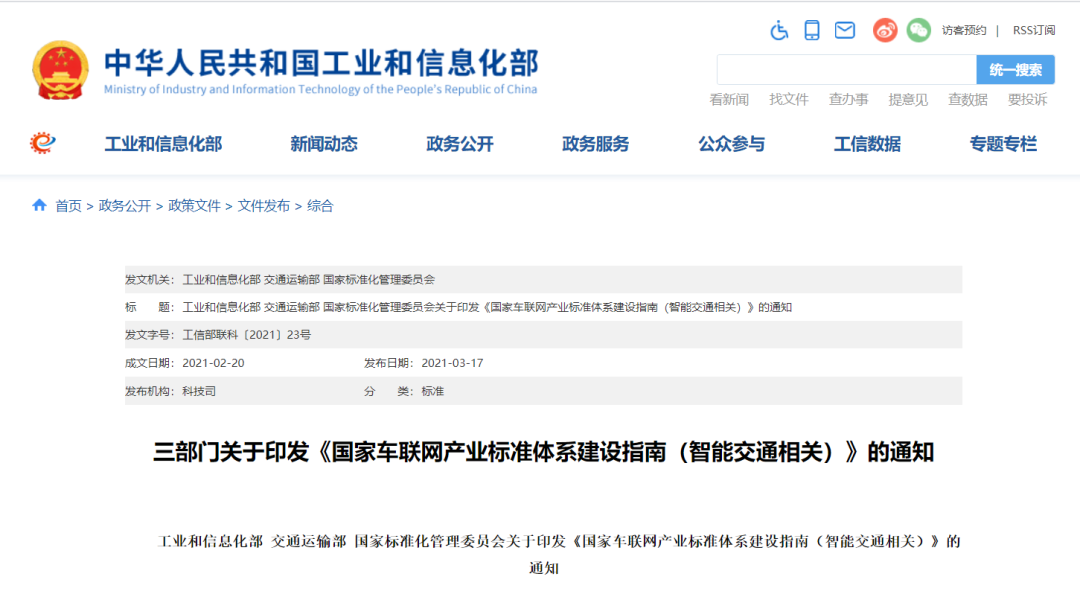近日,工業(yè)和信息化部、交通運輸部、國家標準化管理委員會三部門印發(fā)《國家車聯網產業(yè)標準體系建設指南(智能交通相關)》(下稱“建設指南”)。