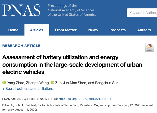 日前,北京理工大學(xué)電動車輛國家工程實驗室孫逢春院士、王震坡教授團(tuán)隊與美國加州大學(xué)伯克利分校終身教授、香港大學(xué)副校長申作軍(Zuo-Jun Max Shen)合作研究成果“Assessment of battery utilization and energy consumption in the large-scale development of urban electric vehicles” (作者:趙洋,王震坡,申作軍,孫逢春),以直接投稿(Direct Submission)、研究性論文(Research Article)形式在世界頂級期刊《美國科學(xué)院院刊》(PNAS)在線發(fā)表。北京理工大學(xué)為論文第一通訊單位,第一作者趙洋是孫逢春院士、王震坡教授與港大申作軍教授聯(lián)合指導(dǎo)的博士研究生;王震坡教授和申作軍教授為該論文共同通訊作者。