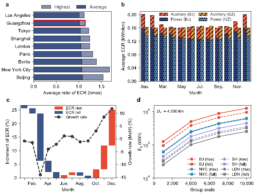 隨著世界范圍電動汽車大規(guī)模部署,電動汽車行業(yè)對動力電池資源和城市能源的需求快速增長,評估城市電動汽車動力電池利用和能量消耗情況具有重要意義。該論文首次將電動汽車大數(shù)據(jù)引入到動力電池資源、城市能源相關(guān)領(lǐng)域,突破了電動汽車動力電池利用和能量消耗大規(guī)模評估的難題,對全球電動汽車大規(guī)模發(fā)展中所涉及的動力電池資源、能源、碳排放等方面研究具有重要意義。該論文通過結(jié)合大規(guī)模城市電動汽車數(shù)據(jù)、統(tǒng)計學(xué)方法和人工智能算法,報告了電動汽車大規(guī)模應(yīng)用與小規(guī)模應(yīng)用所不同的重要規(guī)律,如動力電池利用率差異性和電動汽車能量消耗季節(jié)性波動。引入氣候數(shù)據(jù),將模型拓展到世界多個地區(qū),對比分析了電動汽車動力電池利用率、能耗相關(guān)重要規(guī)律在世界不同地域的差異性。例如,在北京地區(qū),即使電動汽車的月行駛需求不變,季節(jié)變換帶來的電動汽車群體平均能量消耗差異最高可達(dá)21%。