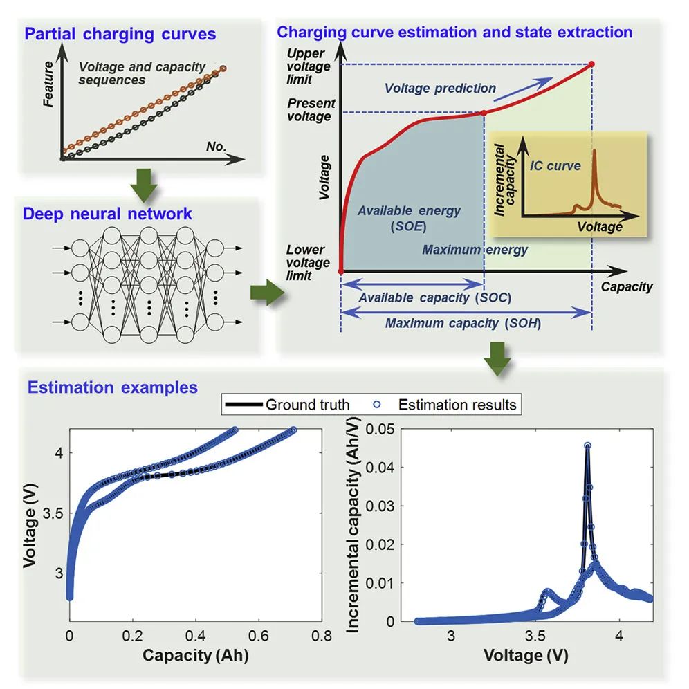 北京理工大學(xué)孫逢春院士團(tuán)隊(duì)先進(jìn)儲(chǔ)能科學(xué)與應(yīng)用課題組創(chuàng)新性地提出了一種應(yīng)用深度神經(jīng)網(wǎng)絡(luò)的充電曲線估計(jì)方法,通過使用少量充電數(shù)據(jù)片段作為深度神經(jīng)網(wǎng)絡(luò)的輸入,實(shí)現(xiàn)了電池老化過程中的完整恒流充電曲線估計(jì),不再止步于最大可用容量的估計(jì),打破了傳統(tǒng)電池健康監(jiān)測的局限性。文章中案例使用不到10分鐘內(nèi)采集的30個(gè)數(shù)據(jù)點(diǎn)便可準(zhǔn)確估計(jì)完整的恒流充電曲線。由于恒流充電是電池日常工作中的相對(duì)穩(wěn)定工況,恒流充電曲線估計(jì)可以進(jìn)一步確定電池最大可用容量/能量、剩余容量/能量、容量微分曲線等關(guān)鍵狀態(tài)。