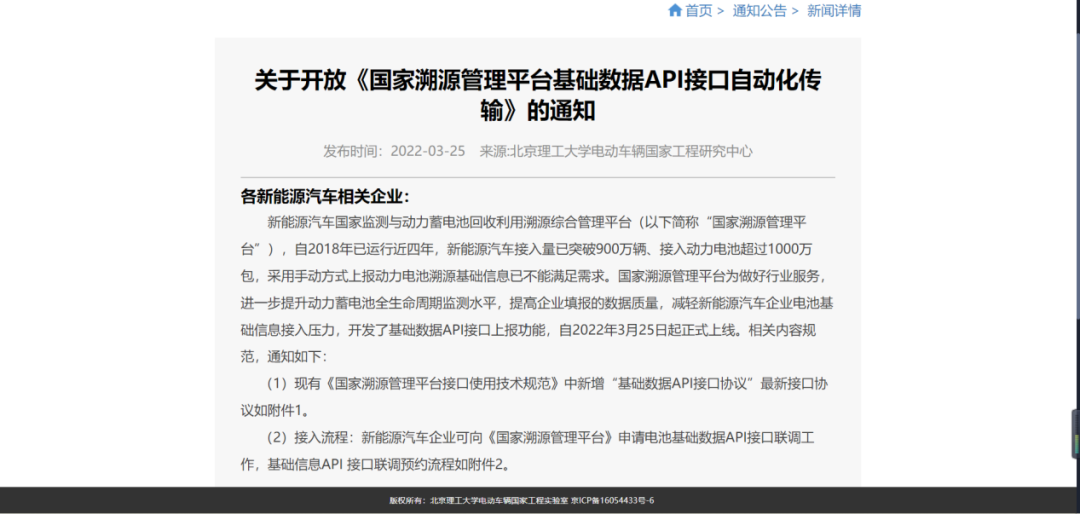 為做好行業(yè)服務(wù),進(jìn)一步提升動(dòng)力蓄電池全生命周期監(jiān)測(cè)水平,提高企業(yè)填報(bào)的數(shù)據(jù)質(zhì)量,減輕新能源汽車企業(yè)電池基礎(chǔ)信息接入壓力,新能源汽車國(guó)家監(jiān)測(cè)與動(dòng)力蓄電池回收利用溯源綜合管理平臺(tái)(以下簡(jiǎn)稱“國(guó)家溯源管理平臺(tái)”)開發(fā)了基礎(chǔ)數(shù)據(jù)API接口上報(bào)功能,自2022年3月25日起正式上線。國(guó)家溯源管理平臺(tái)官網(wǎng)當(dāng)天發(fā)布了《國(guó)家溯源管理平臺(tái)接口使用技術(shù)規(guī)范》與申請(qǐng)電池基礎(chǔ)數(shù)據(jù)API接口聯(lián)調(diào)工作流程。