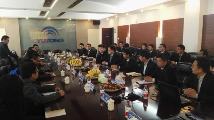 黨支部一行人首先來到鄭州宇通客車股份有限公司進行了校企交流活動。宇通客車公司校友李飛強博士帶領(lǐng)黨支部參觀了總裝車間、技術(shù)中心和國家電動課程電控與安全工程實驗室,詳細介紹了宇通公司在客車技術(shù)研發(fā)方面技術(shù)條件的經(jīng)驗。宇通客車公司總工程師、校友李高鵬博士會見了黨支部一行,對企業(yè)與學(xué)校在新能源客車技術(shù)合作以及在人才培養(yǎng)等領(lǐng)域協(xié)同創(chuàng)新的歷史及現(xiàn)狀進行了回顧,充分肯定北京理工大學(xué)在服務(wù)產(chǎn)業(yè)發(fā)展、技術(shù)合作創(chuàng)新、優(yōu)秀高水平人才輸送及在職人才培養(yǎng)等方面為企業(yè)技術(shù)升級轉(zhuǎn)型所提供的有力幫助和卓越成果。王志福書記就加強雙方技術(shù)合作、黨建活動和人才培養(yǎng)模型也與公司進行了溝通。會上李飛強博士作了《宇通新能源客車技術(shù)發(fā)展現(xiàn)狀及趨勢》報告,匯報了宇通客車近年來的飛速發(fā)展和后期新技術(shù)的突破方向。北京理工大學(xué)機械與車輛學(xué)院副院長何洪文教授參加了會面交流,并以《混合動力電動車輛整車控制及能量管理優(yōu)化》為題目作了前沿性報告。部分電動車輛實驗室畢業(yè)的學(xué)生從西安、北京、洛陽等地也來到現(xiàn)場參加了相關(guān)活動,為實驗室和學(xué)校人才培養(yǎng)與企業(yè)需求等方面建言獻策。